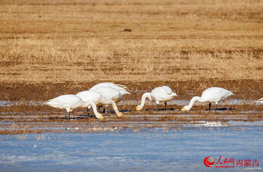 White swans forage in a wetland in Togtoh county, north China's Inner Mongolia Autonomous Region. (Photo/Wuligeng)