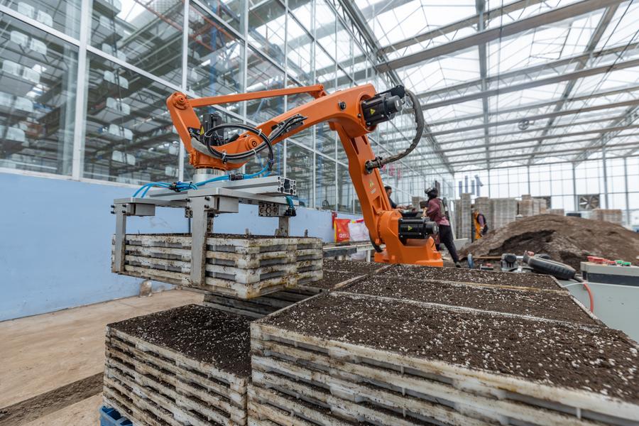 A robot carries seedling trays at an intelligent seedling breeding base in Shuangxing Village of Xianlong Town, southwest China's Chongqing, March 12, 2024. (Xinhua/Huang Wei)