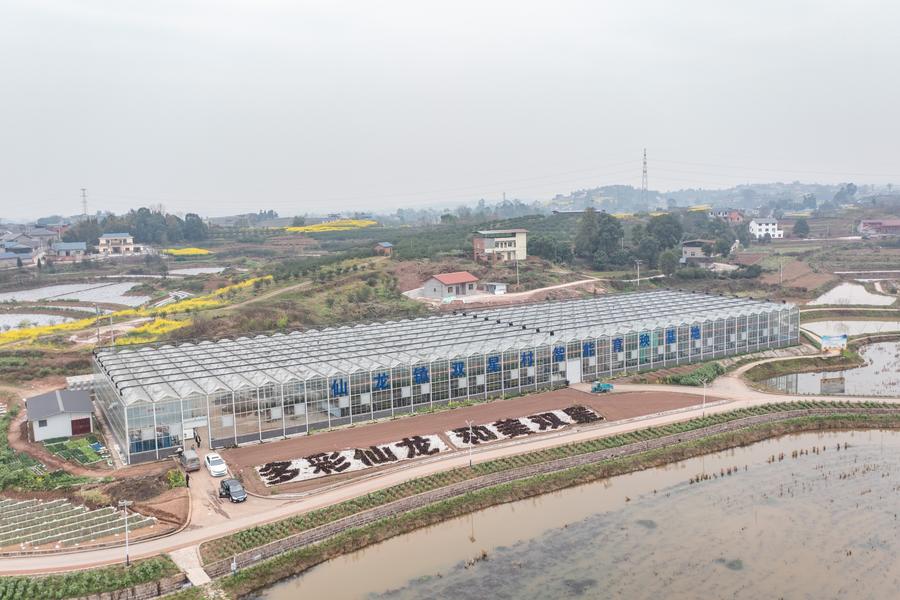 An aerial drone photo shows an intelligent seedling breeding base in Shuangxing Village of Xianlong Town, southwest China's Chongqing, March 12, 2024. (Xinhua/Huang Wei)