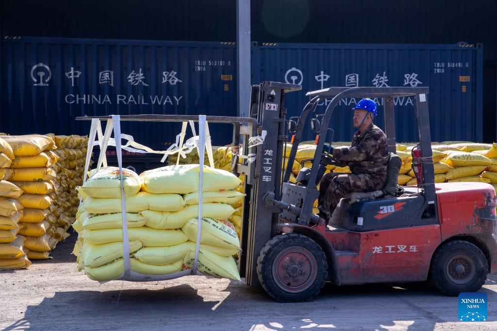 A worker transports chemical fertilizer at the freight yard of Zhaodong Station, Daqing depot of China Railway Harbin Bureau Group Co., Ltd., northeast China's Heilongjiang Province, March 13, 2024. As spring farming activities is about to start in Heilongjiang, a major grain producing province, China Railway Harbin Bureau Group Co., Ltd. has established a regular contact mechanism involving local fertilizer dealers, with more than 500,000 tonnes of fertilizer transported since the beginning of 2024. (Xinhua/Zhang Tao)