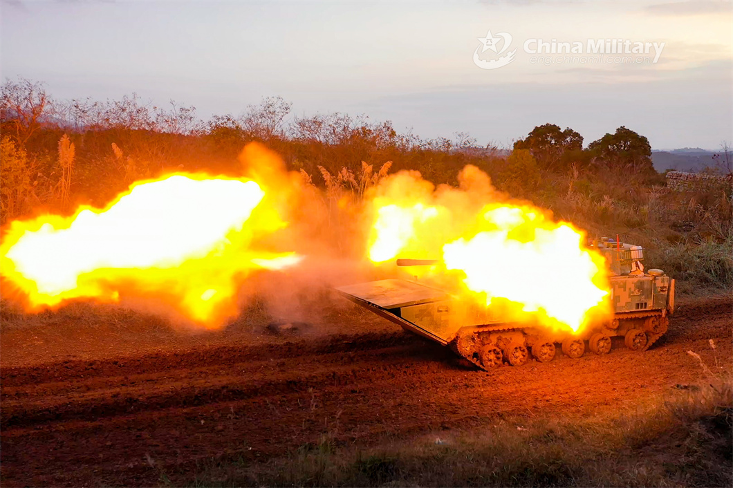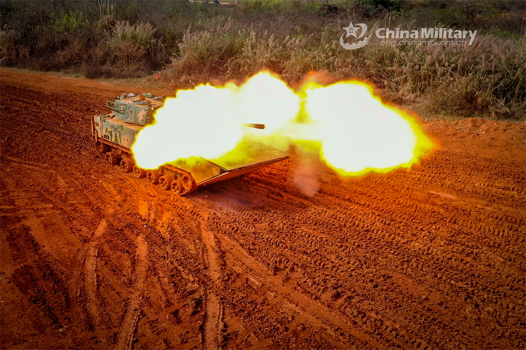 An amphibious assault vehicle attached to a brigade under the PLA Eastern Theater Command fires at mock targets during a live-fire training exercise in late February, 2024. (eng.chinamil.com.cn/Photo by Zeng Bingyang)