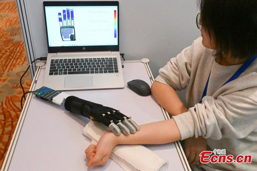 A tactile dexterous hand that can feel the pulse is displayed at the Humanoid Robot Competition held in the Beijing Economic-Technological Development Area, March 13, 2024. (Photo: China News Service)