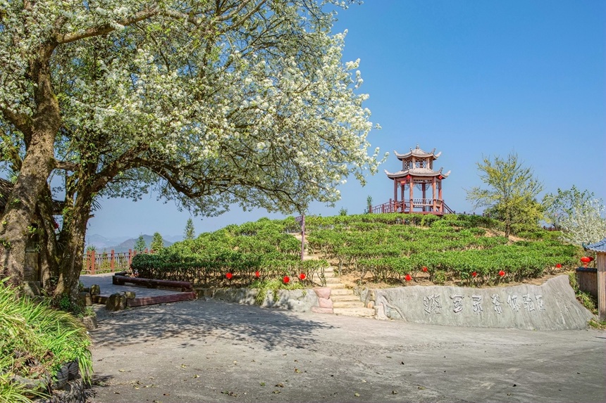 Photo shows pear blossoms at an organic tea garden in Yanglong village, Xilin county, Baise, south China's Guangxi Zhuang Autonomous Region. (Photo/Li Shihua)