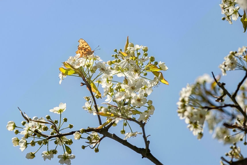 Wild pear trees have burst into full bloom in an organic tea garden of Yanglong village, Xilin county, Baise, south China's Guangxi Zhuang Autonomous Region, filling the air with a delicate fragrance.
