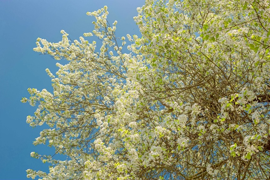 Clusters of white pear flowers give the tea garden a noticeable sense of spring.