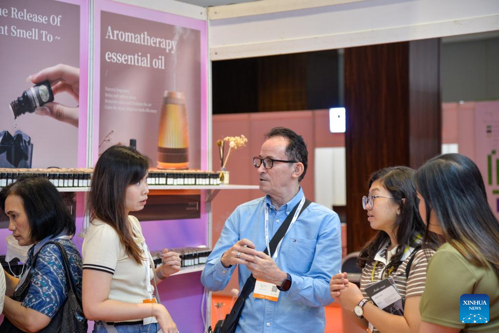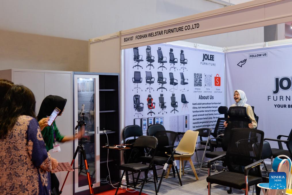 Exhibitors promote their products via livestream at a booth at the China Trade Fair Indonesia 2024 in Jakarta, Indonesia, March 13, 2024. The China Trade Fair Indonesia 2024 began here on Wednesday, attracting over 400 suppliers from several provinces in China, including Guangdong, Zhejiang and Jiangsu. (Xinhua/Xu Qin)