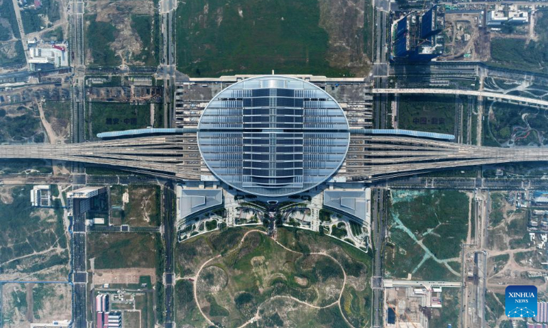 Aerial photo taken on Sept. 9, 2022 shows the Xiong'an Railway Station in Xiong'an New Area, north China's Hebei Province. (Xinhua/Xing Guangli)