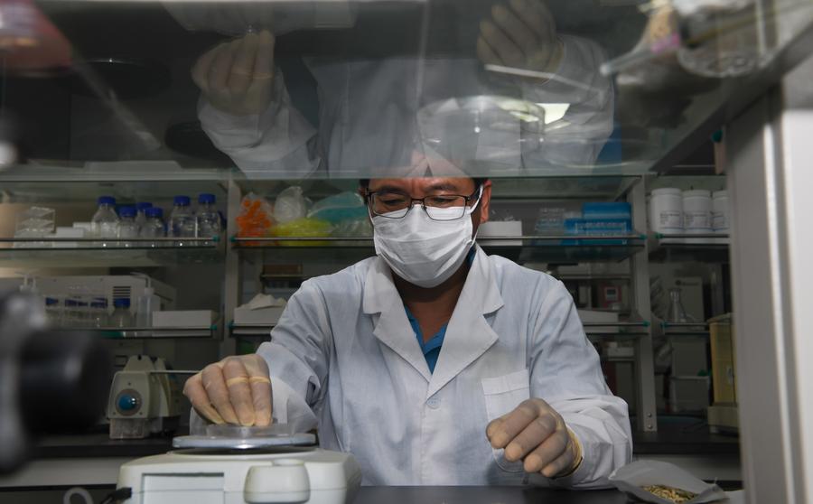 Liu Huazhao, a researcher with the Institute of Botany under the Chinese Academy of Sciences, performs an experiment in a breeding base in Lingshui, south China's Hainan Province, March 8, 2024. (Xinhua/Yang Guanyu)