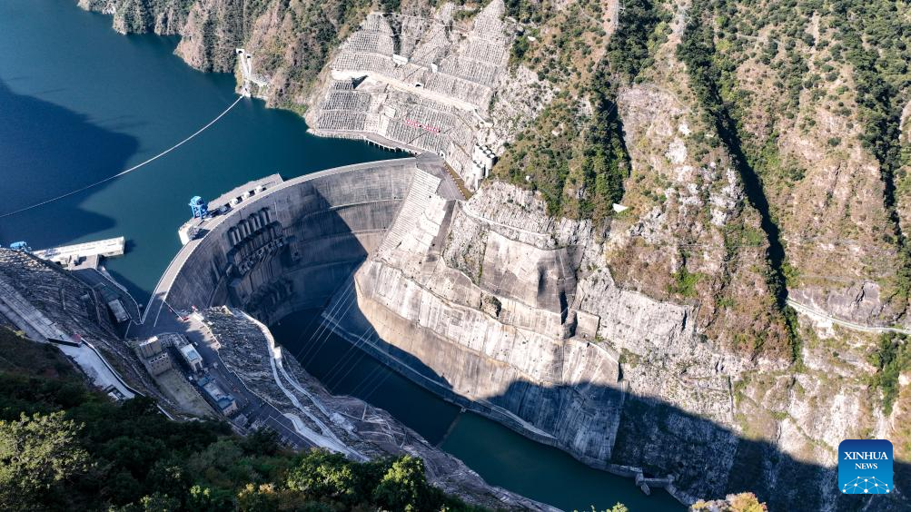 An aerial drone photo taken on Nov. 2, 2022 shows a hydropower station of the Yalong River basin hydro-wind-photovoltaic multi-energy power base in southwest China's Sichuan Province.(Yalong River Hydropower Development Company, Ltd./Handout via Xinhua)