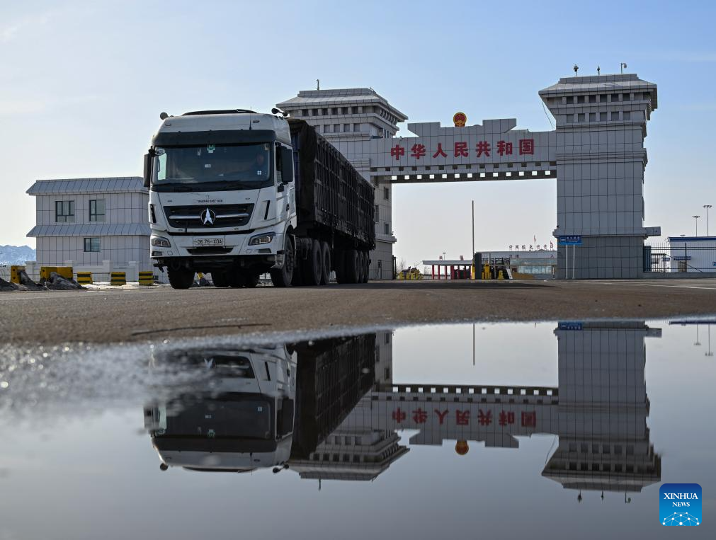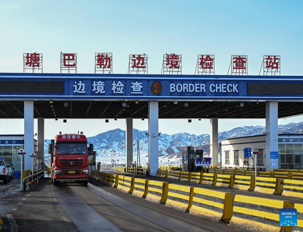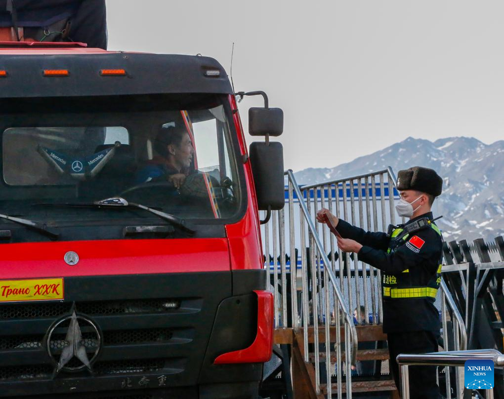 A vehicle passes a border check station of Takixken road port in northwest China's Xinjiang Uygur Autonomous Region, March 13, 2024. (Xinhua/Chen Shuo)