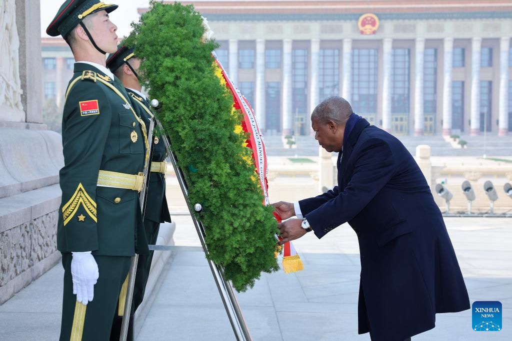 Angolan President Joao Lourenco lays a wreath at the Monument to the People's Heroes on the Tian'anmen Square in Beijing, capital of China, March 15, 2024. (Xinhua/Liu Bin)
