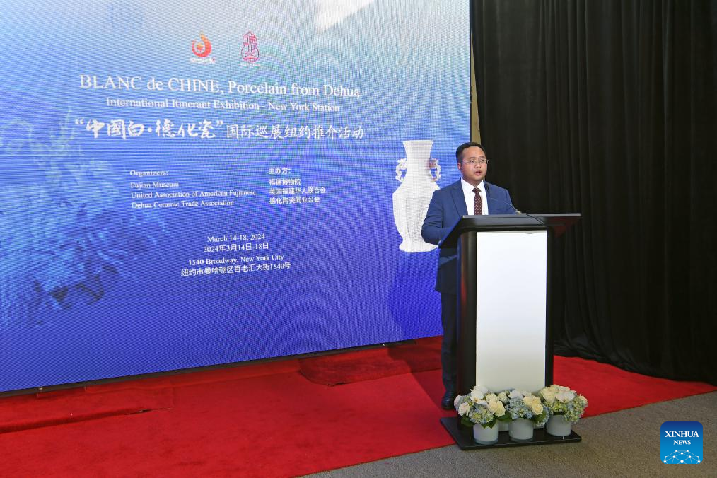 Fang Junqin, head of Dehua County of China's Fujian province, speaks at "Blanc de Chine - Dehua Porcelain" international exhibition in New York, the United States, on March 14, 2024. A five-day event to showcase white porcelain produced in Dehua County in China's southeastern Fujian province kicked off on Thursday in Midtown, New York City, with 105 masterpieces of Dehua porcelain exhibited. (Xinhua/Li Rui)