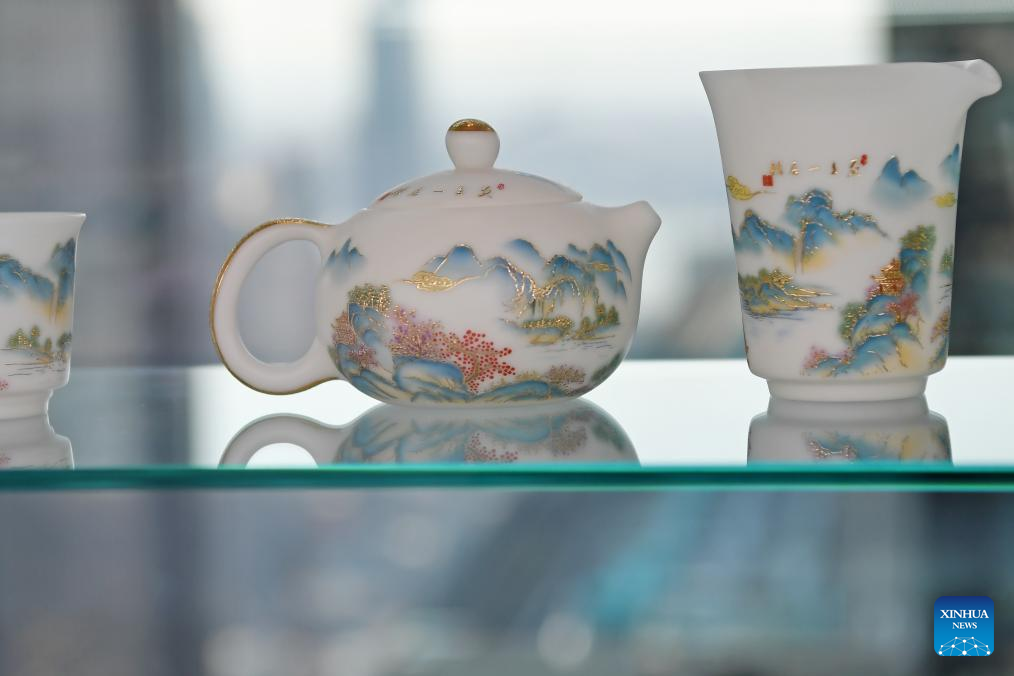 A Dehua porcelain tea set is presented at "Blanc de Chine - Dehua Porcelain" international exhibition in New York, the United States, on March 14, 2024. A five-day event to showcase white porcelain produced in Dehua County in China's southeastern Fujian province kicked off on Thursday in Midtown, New York City, with 105 masterpieces of Dehua porcelain exhibited. (Xinhua/Li Rui)