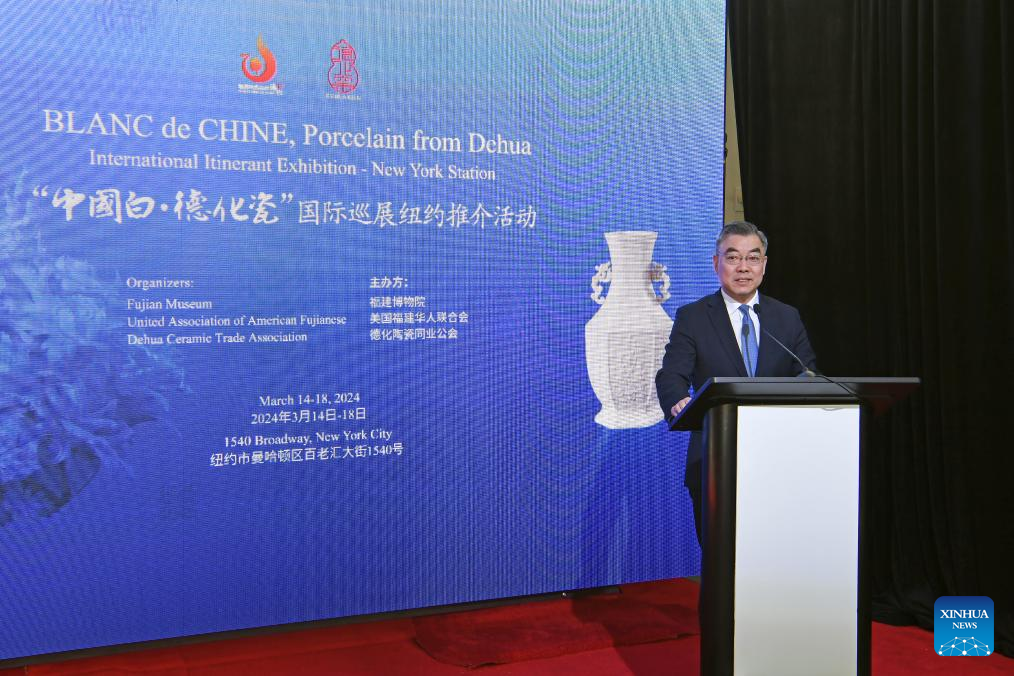 Huang Ping, the Chinese consul general in New York, speaks at "Blanc de Chine - Dehua Porcelain" international exhibition in New York, the United States, on March 14, 2024. A five-day event to showcase white porcelain produced in Dehua County in China's southeastern Fujian province kicked off on Thursday in Midtown, New York City, with 105 masterpieces of Dehua porcelain exhibited. (Xinhua/Li Rui)