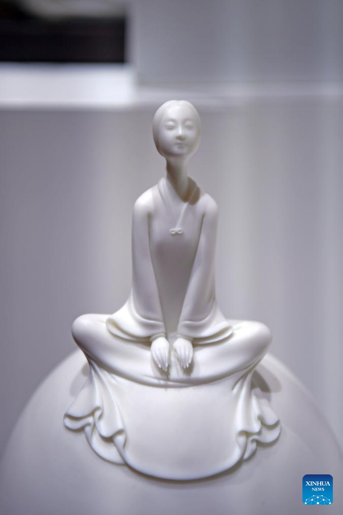 Dehua porcelain artworks are presented at "Blanc de Chine - Dehua Porcelain" international exhibition in New York, the United States, on March 14, 2024. A five-day event to showcase white porcelain produced in Dehua County in China's southeastern Fujian province kicked off on Thursday in Midtown, New York City, with 105 masterpieces of Dehua porcelain exhibited. (Xinhua/Li Rui)