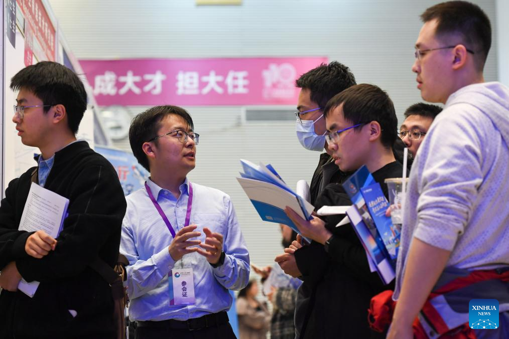 Students inquire about job opportunities at a job fair in Tsinghua University in Beijing, capital of China, March 15, 2024.
