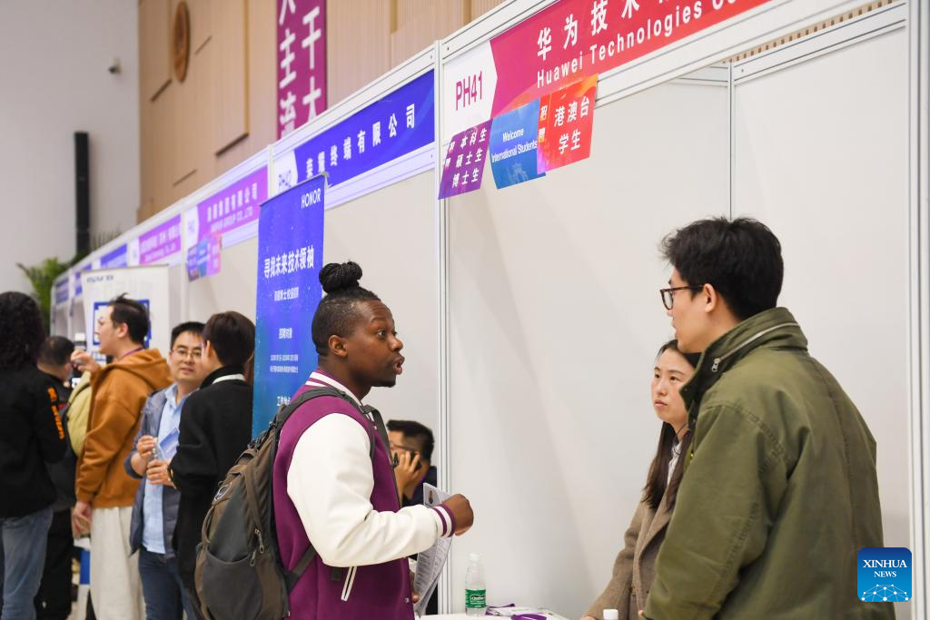 A foreign student (L, front) inquires about job opportunities at a job fair in Tsinghua University in Beijing, capital of China, March 15, 2024.
