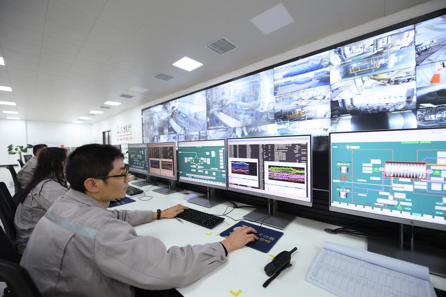 Workers operate the centralized control system at the control room of a company in Keqiao District of Shaoxing, east China's Zhejiang Province, March 14, 2024. (Xinhua/Weng Xinyang)