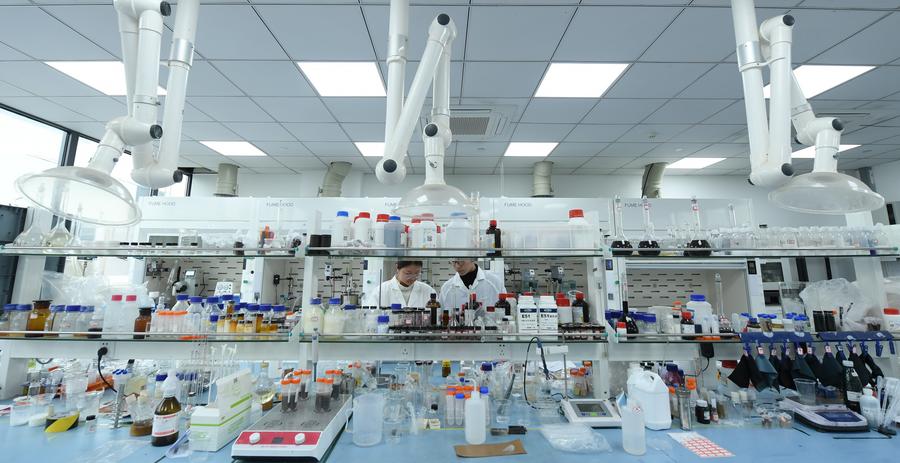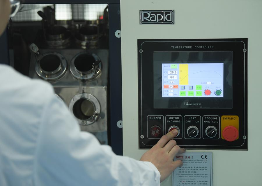A dyeing technician conducts experiments at a company in Keqiao District of Shaoxing, east China's Zhejiang Province, March 14, 2024. (Xinhua/Weng Xinyang)