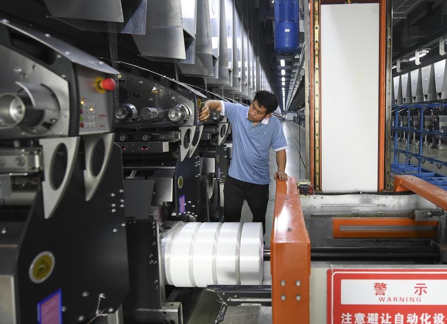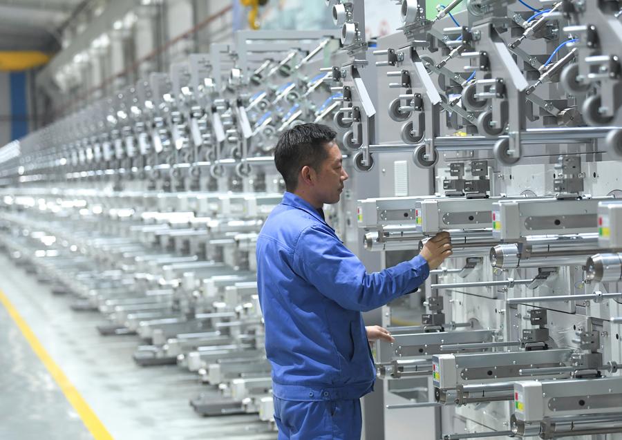 A worker operates an automated winder at a company in Keqiao District of Shaoxing, east China's Zhejiang Province, March 14, 2024. (Xinhua/Weng Xinyang)