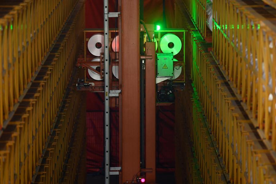 Robots deposit fiber products into a three-dimensional warehouse at a company in Keqiao District of Shaoxing, east China's Zhejiang Province, March 14, 2024. (Xinhua/Weng Xinyang)