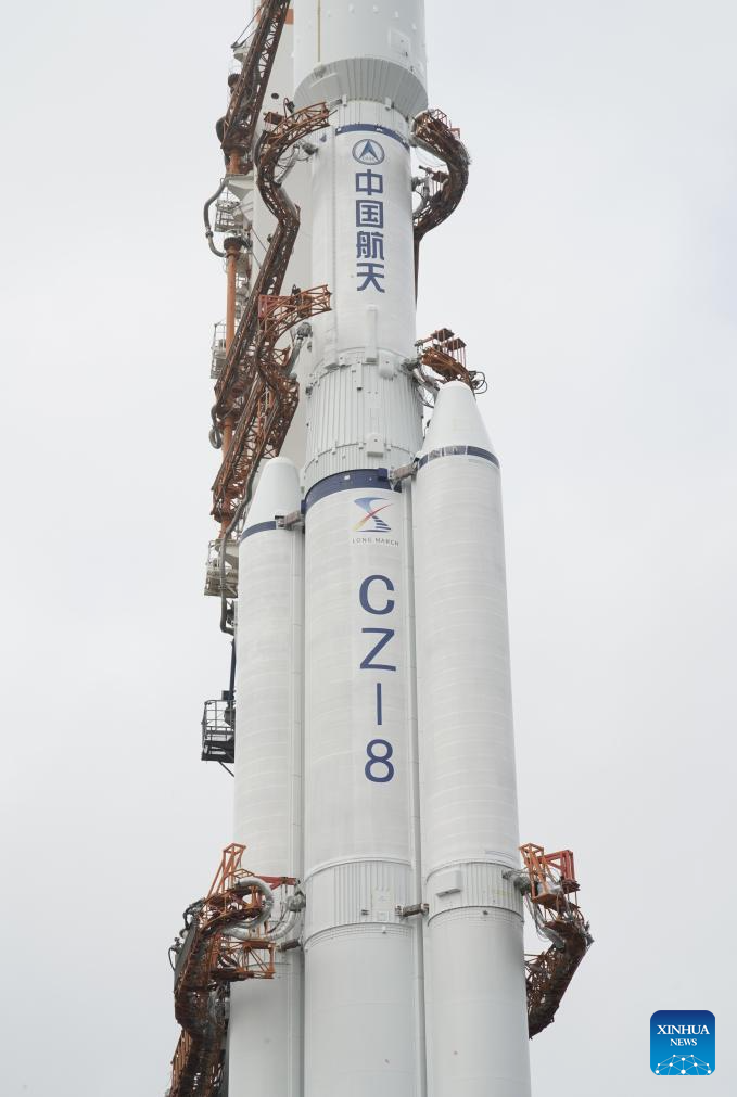 WENCHANG, Hainan, March 17 (Xinhua) -- The combination of the relay satellite Queqiao-2 and the Long March-8 Y3 carrier rocket was vertically transferred on Sunday to the launching area at the Wenchang Space Launch Center in south China's Hainan Province.