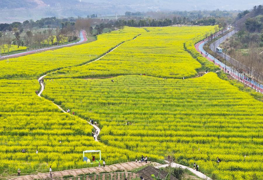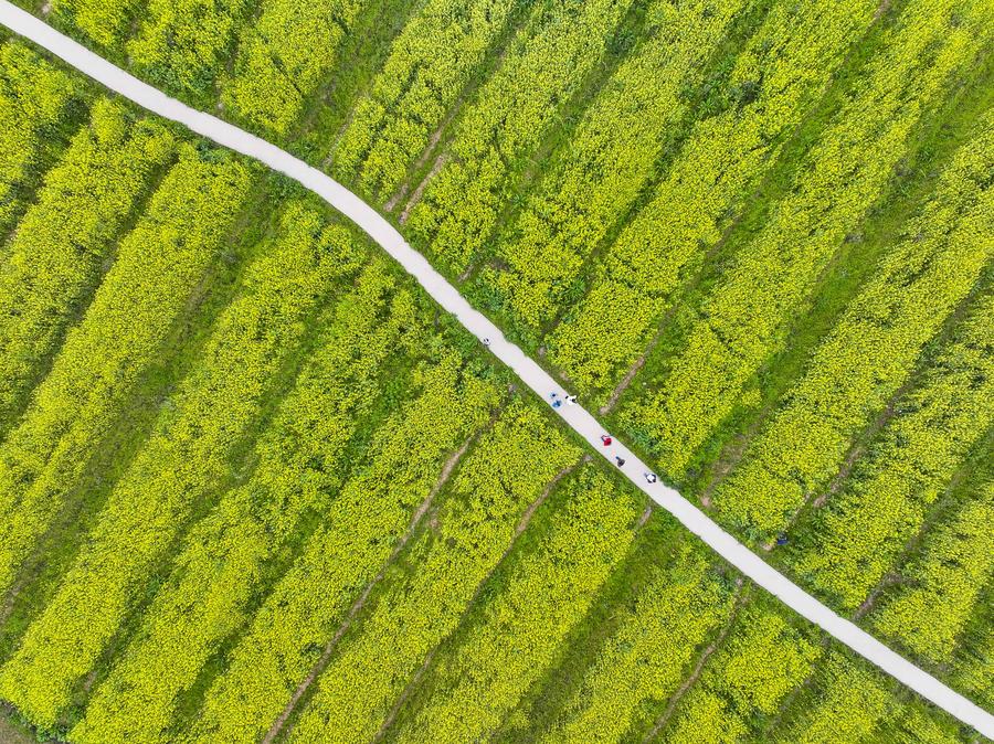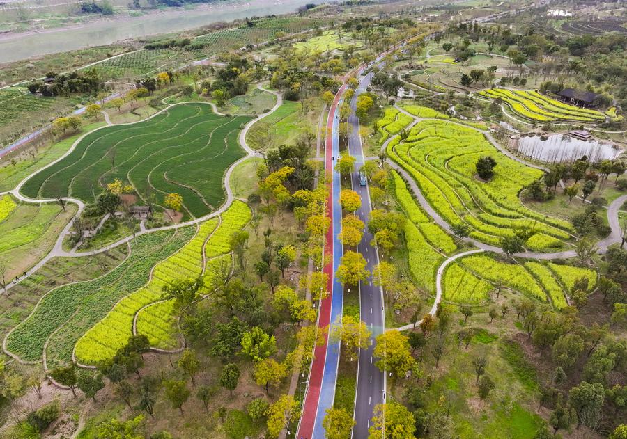An aerial drone photo shows fields of cole flowers at Guangyang Isle in southwest China's Chongqing, March 16, 2024. (Xinhua/Wang Quanchao)