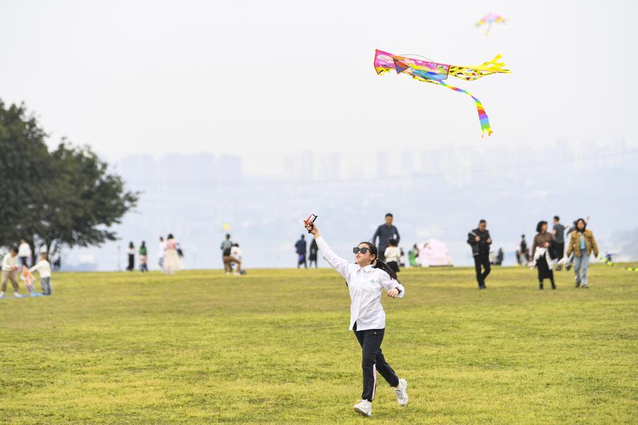 A child flies a kite at Guangyang Isle in southwest China's Chongqing, March 16, 2024. (Xinhua/Wang Quanchao)