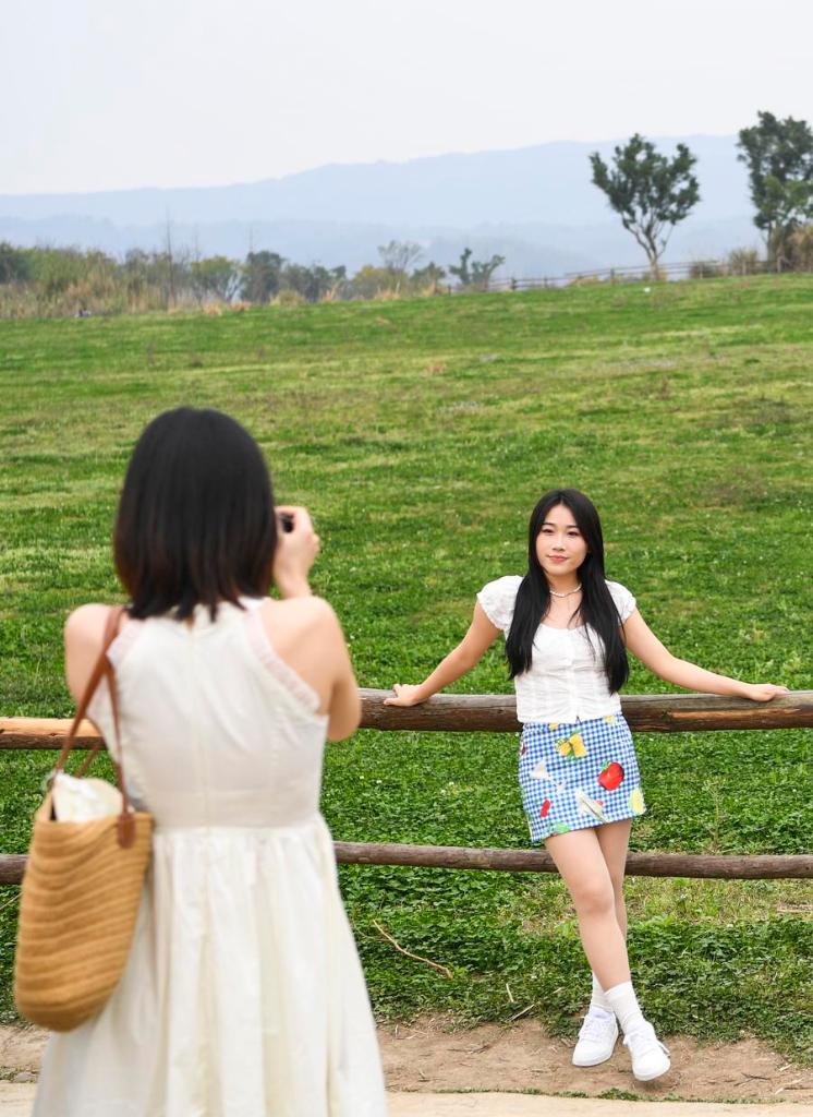 Tourists take photos at Guangyang Isle in southwest China's Chongqing, March 16, 2024. (Xinhua/Wang Quanchao)
