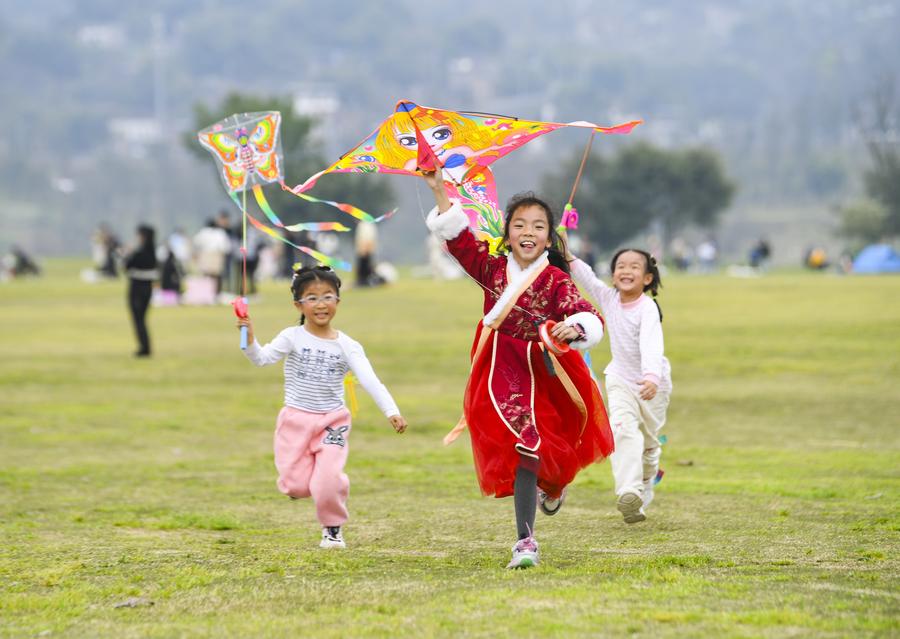 Children have fun at Guangyang Isle in southwest China's Chongqing, March 16, 2024. (Xinhua/Wang Quanchao)