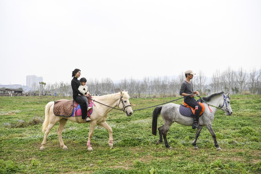 Tourists ride a horse at Guangyang Isle in southwest China's Chongqing, March 16, 2024. (Xinhua/Wang Quanchao)