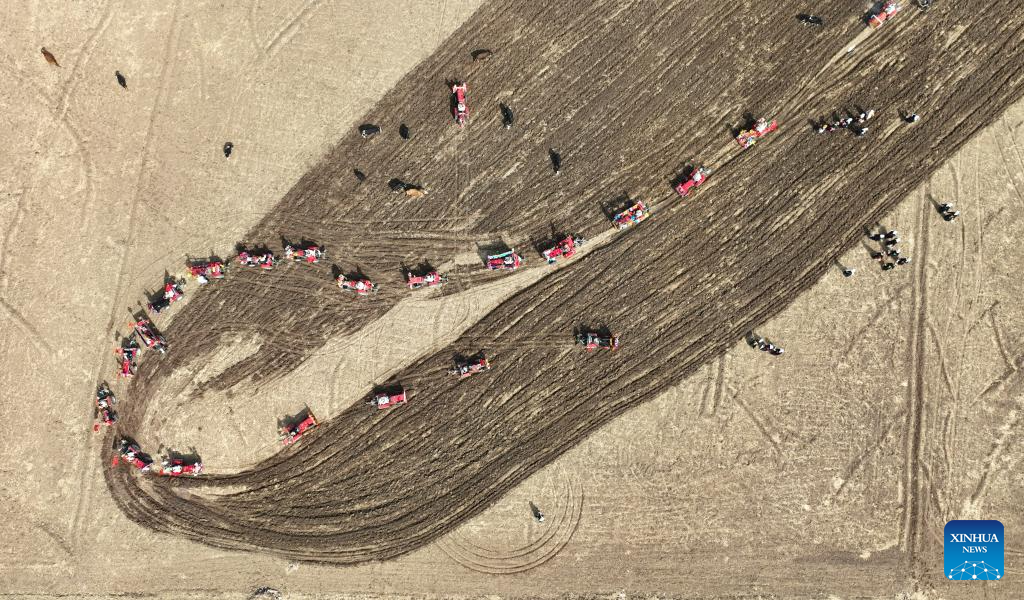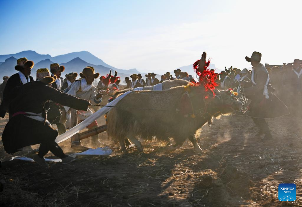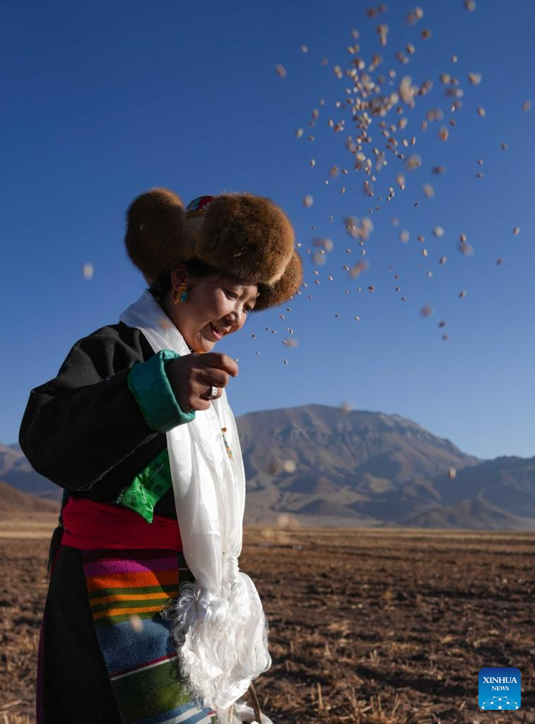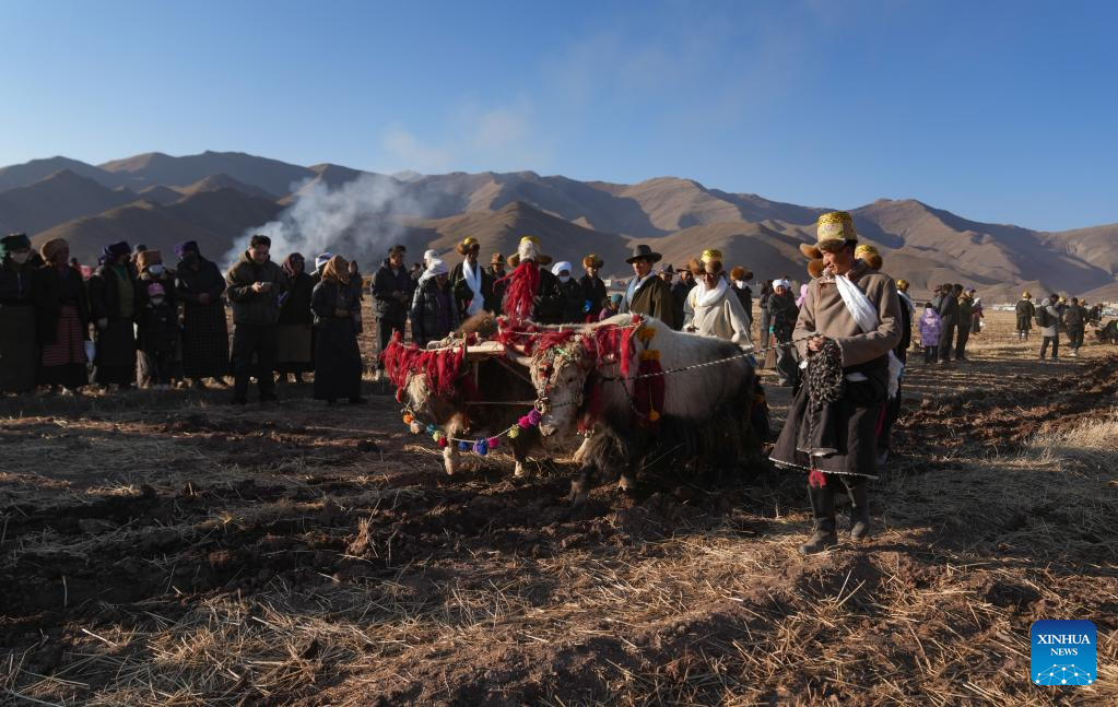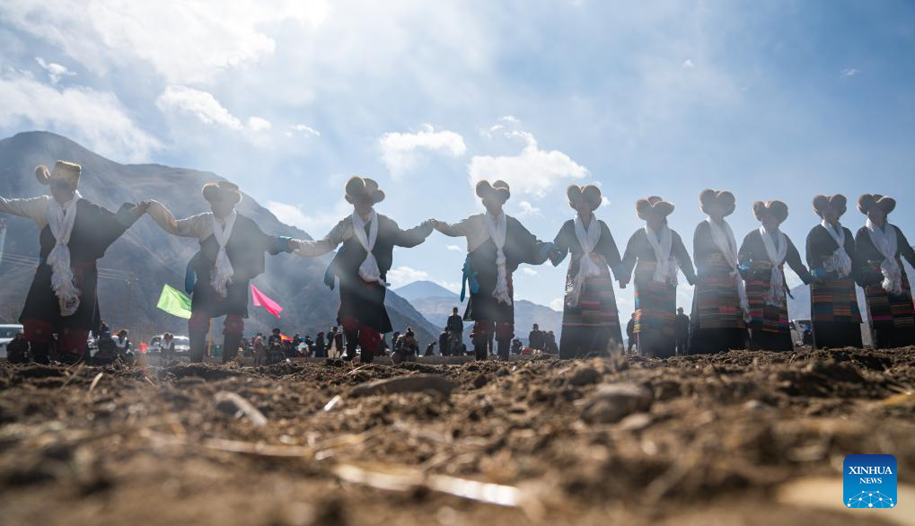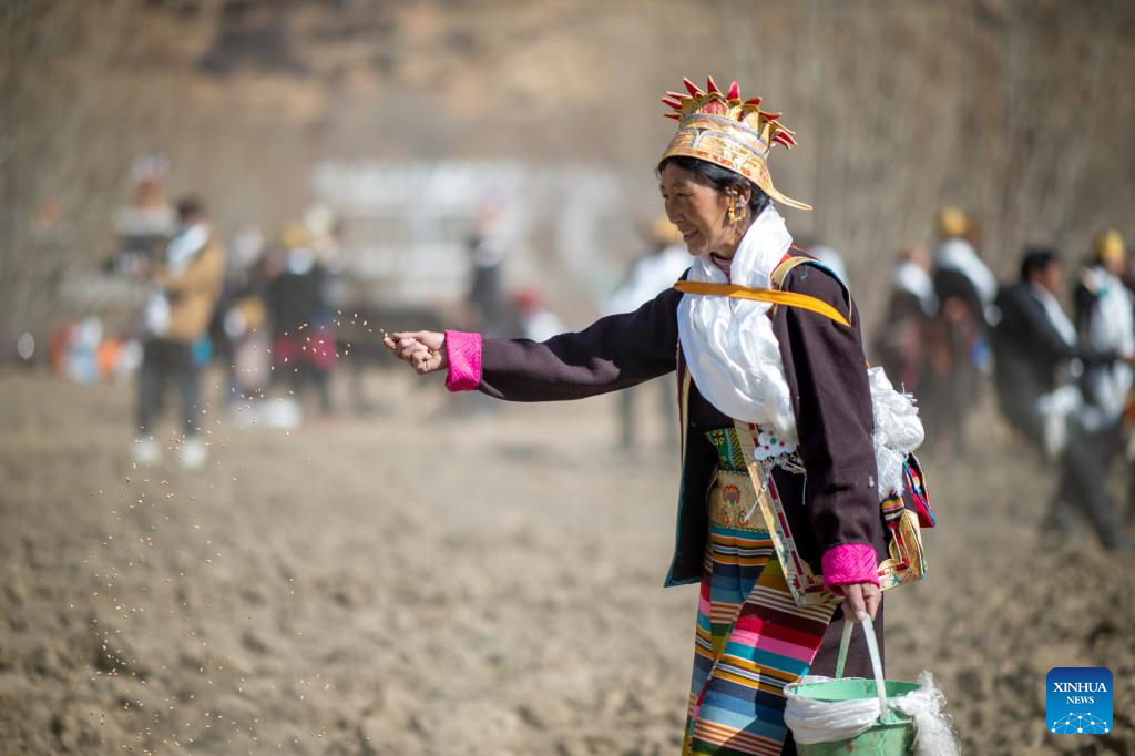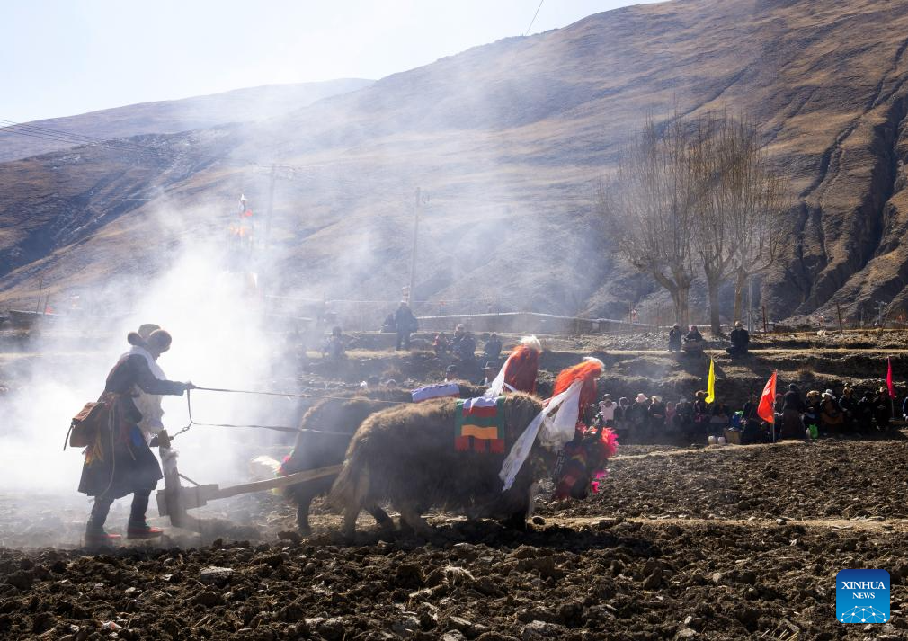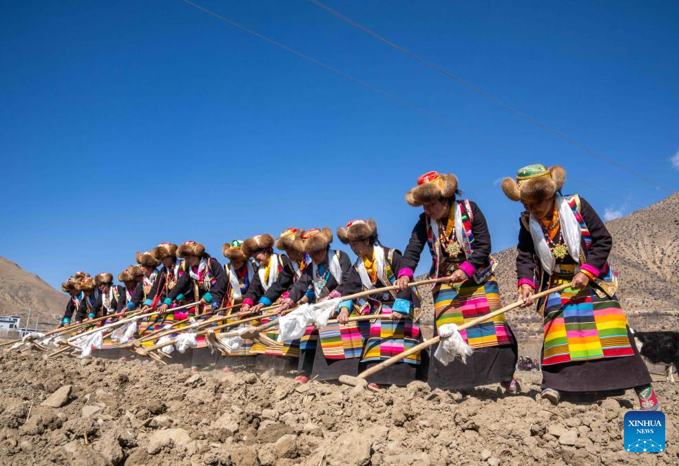 Farmers participate in a ceremony marking the start of spring farming in Gyaimain Village in Qonggyai County of Shannan, southwest China's Xizang Autonomous Region, March 16, 2024. (Xinhua/Tenzing Nima Qadhup)
