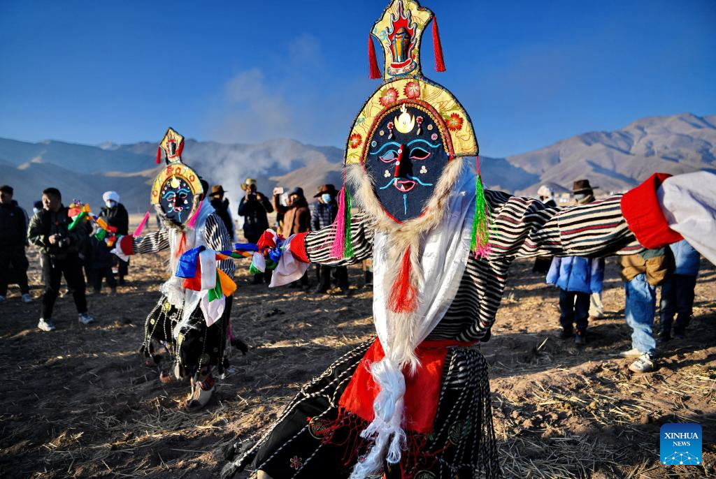 Farmers perform traditional opera during a ceremony marking the start of spring farming in Codoi Town in Lhunzhub County of Lhasa, southwest China's Xizang Autonomous Region, March 16, 2024. (Xinhua/Zhang Rufeng)