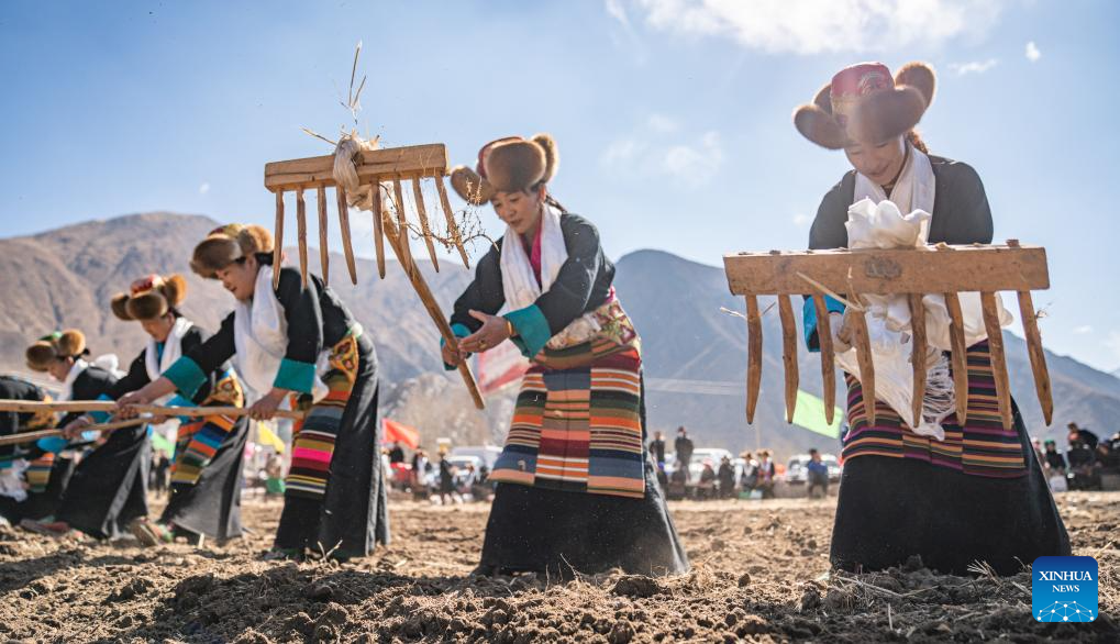 Ceremonies marking the start of spring farming were held in Xizang on Saturday during which farmers held "chema" (a wooden box filled with colorful grains and barley flour, symbolizing good luck and prosperity in Tibetan culture), sang songs, and toasted each other with barley wine. The ceremony holds great significance as it marks the beginning of a new year's farming season and serves as a prayer for favorable weather and bountiful harvests. It is considered an important ritual in the farming regions of Xizang.
