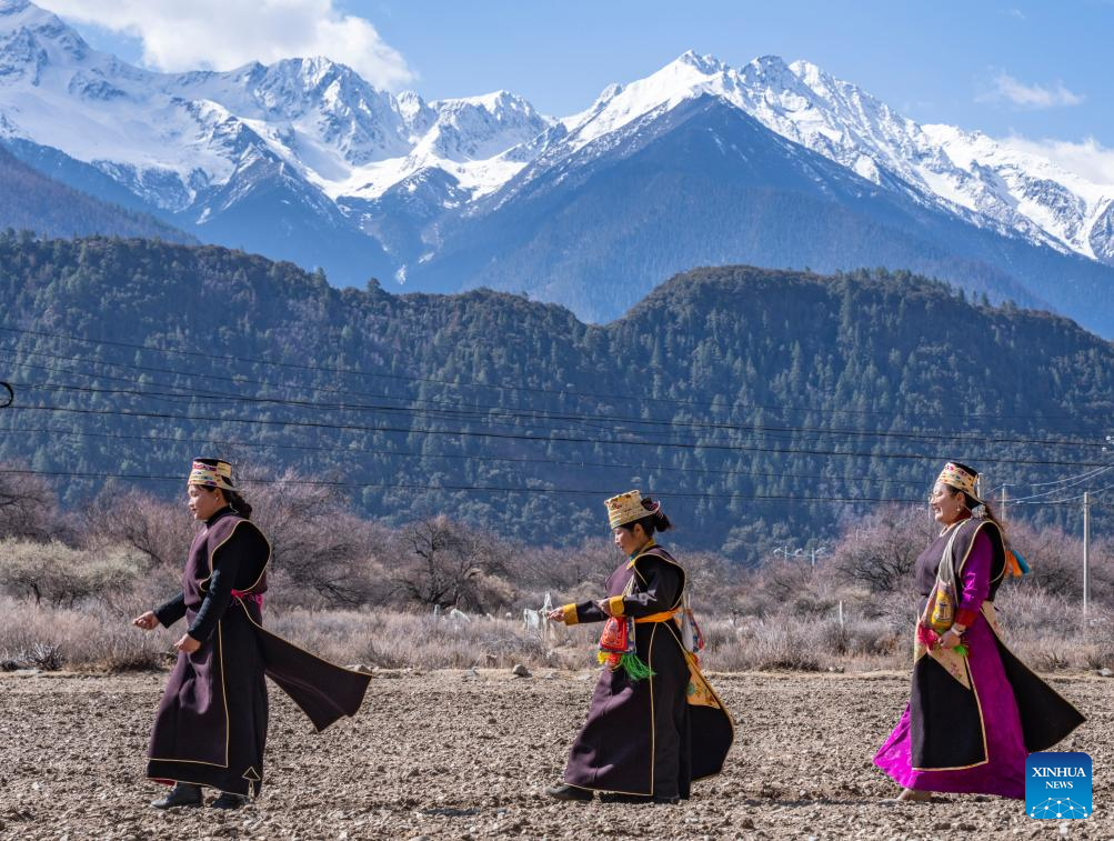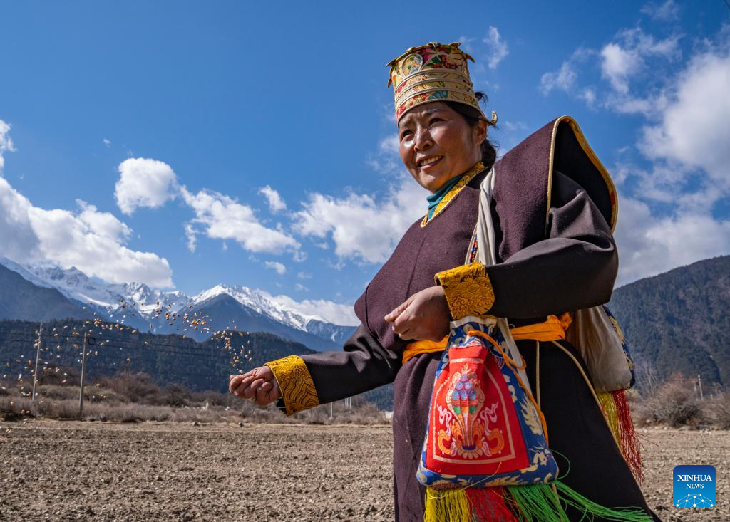 Farmers participate in a ceremony marking the start of spring farming in a village of Gongbo'Gyamda County, Nyingchi City, southwest China's Xizang Autonomous Region, March 16, 2024. (Xinhua/Sun Fei)
