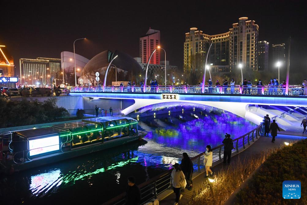 Tourists enjoy themselves along the Liangma River in Beijing, capital of China, March 16, 2024. A promotion event of the Liangma River was held on Saturday in Beijing. (Xinhua/Ju Huanzong)