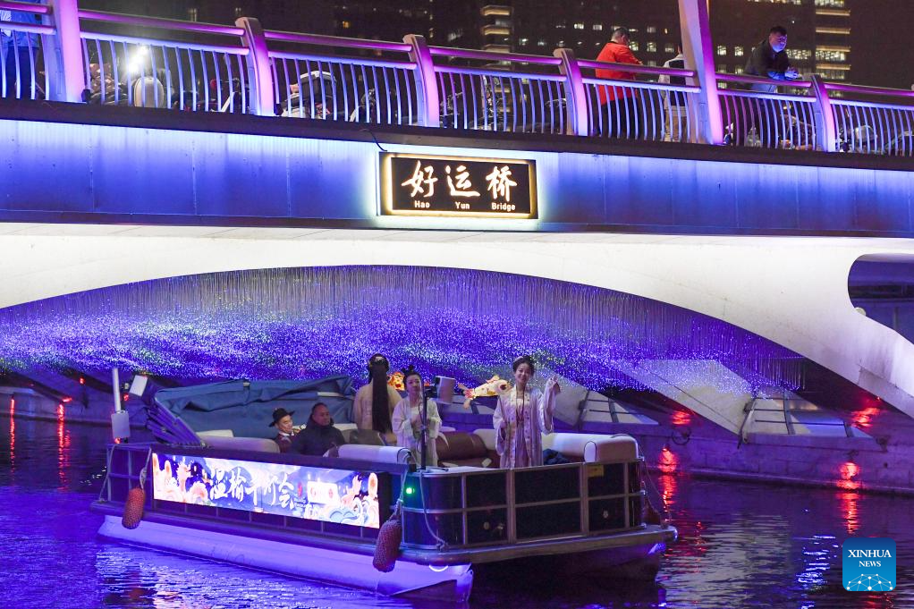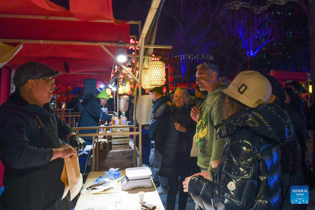 Tourists visit a cultural event along the Liangma River in Beijing, capital of China, March 16, 2024. A promotion event of the Liangma River was held on Saturday in Beijing. (Xinhua/Ju Huanzong)