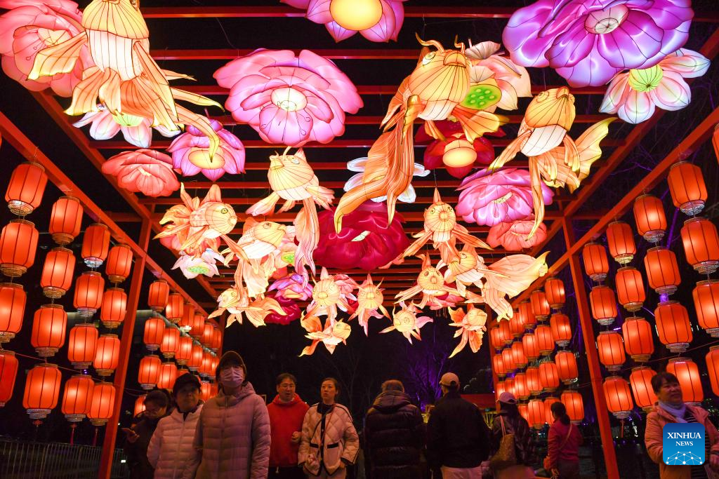 Tourists take photos of a fish-shaped lantern at an event along the Liangma River in Beijing, capital of China, March 16, 2024. A promotion event of the Liangma River was held on Saturday in Beijing. (Xinhua/Ju Huanzong)