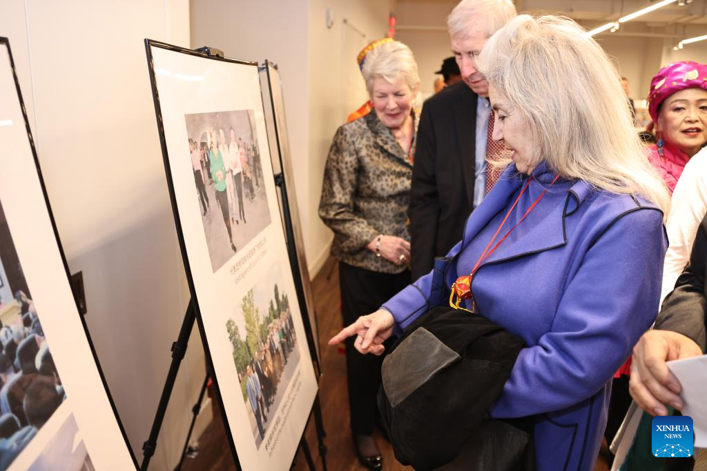 Jan Berris, vice president of the National Committee on U.S.-China Relations, views the "Sino-American Friendship in Guangxi" photo exhibition in New York, the United States, March 11, 2024. The event was held by the Guangxi People's Association for Friendship with Foreign Countries to commemorate the 45th anniversary of China-U.S. diplomatic ties. (Photo by Winston Zhou/Xinhua)