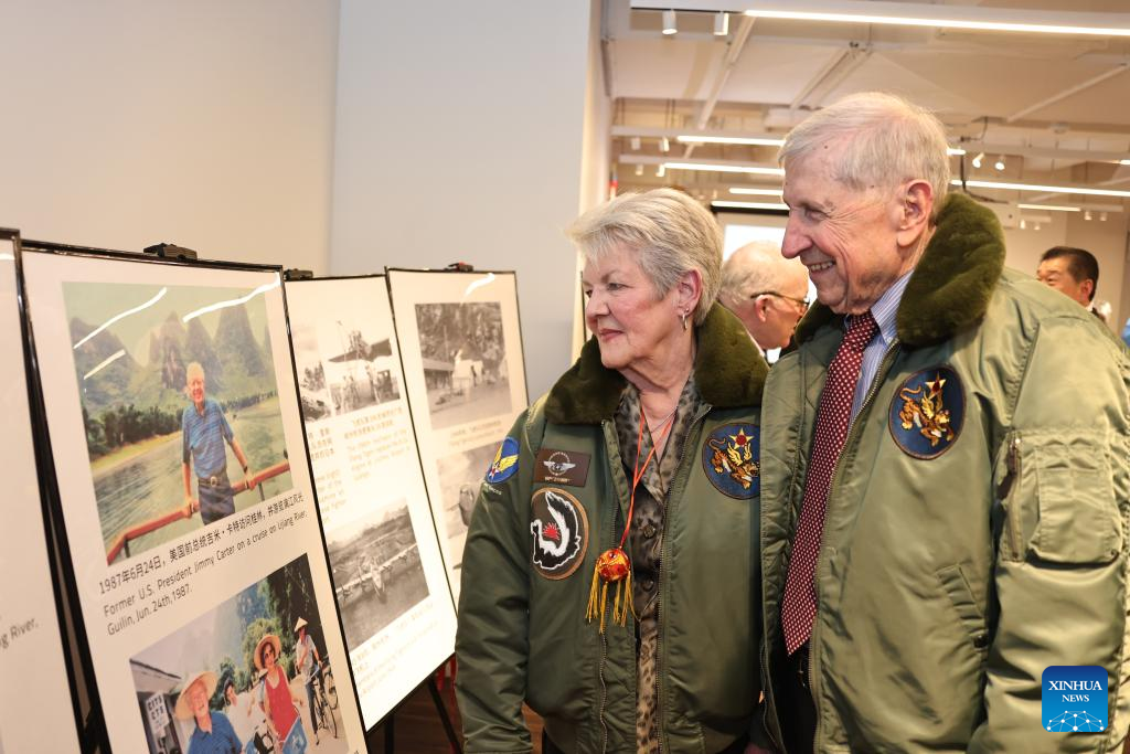 Margaret Mills Kincannon, vice-chairman of the Sino-American Aviation Heritage Foundation, and her husband view the "Sino-American Friendship in Guangxi" photo exhibition in Flying Tigers uniforms in New York, the United States, March 11, 2024. The event was held by the Guangxi People's Association for Friendship with Foreign Countries to commemorate the 45th anniversary of China-U.S. diplomatic ties. (Photo by Winston Zhou/Xinhua)