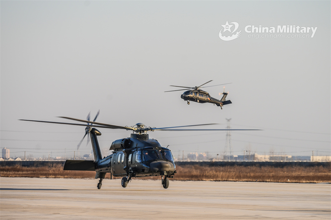 Helicopters attached to a brigade under the PLA 71st Group Army lift off successively from the parking apron during a flight training exercise on February 26, 2024. (eng.chinamil.com.cn/Photo by Li Jingyou)