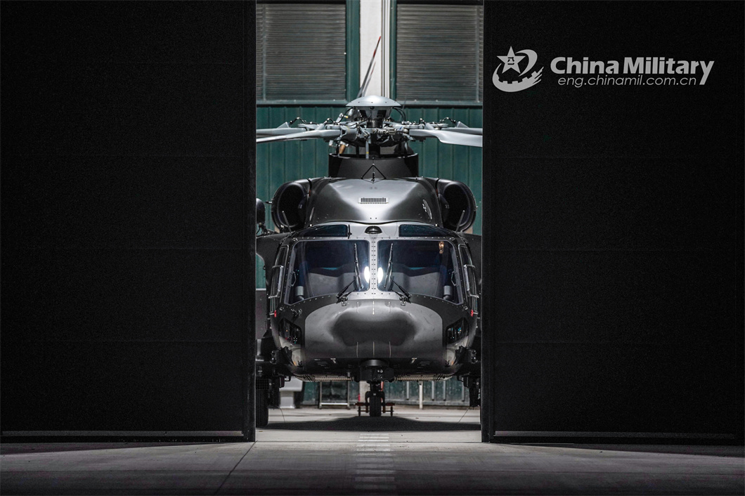 A helicopter attached to a brigade under the PLA 71st Group Army gets ready for a flight training exercise after completing pre-flight inspections in hangar on February 26, 2024. (eng.chinamil.com.cn/Photo by Li Jingyou)
