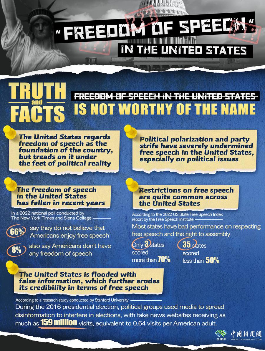 China's Ministry of Foreign Affairs released a report on Thursday that presents the truth and facts of "freedom of speech" in the United States. The report states that freedom of speech is not worthy of the name as the U.S. public doesn't feel free to say what they want, and they have grown to see through and get tired of the hypocritical slogans and promises of politicians.