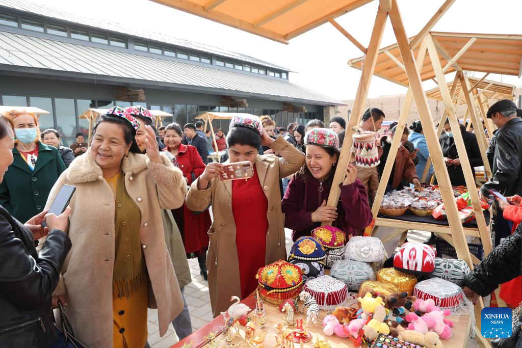 Tourists buy special local products at a market in Kuqa City in northwest China's Xinjiang Uygur Autonomous Region, March 15, 2024.(Xinhua/Zhang Yu)