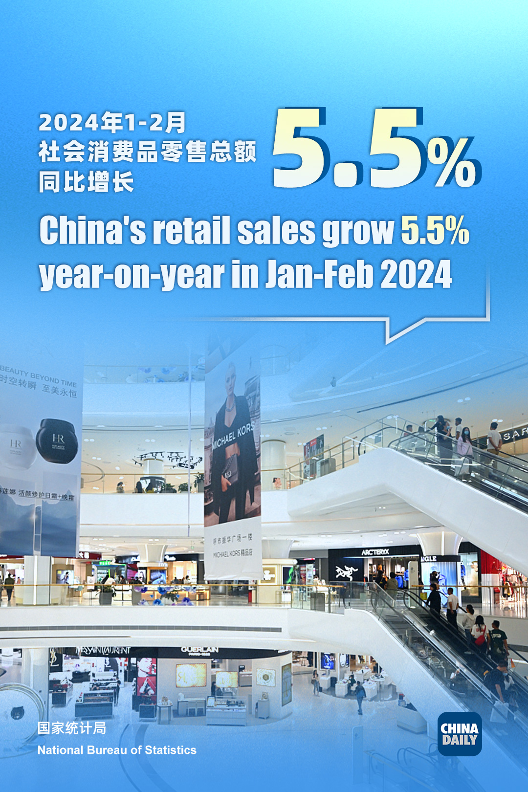 Retail sales, a key measurement of consumer spending, surged 5.5 percent year-on-year in the January-February period, after the 7.4 percent rise in December.