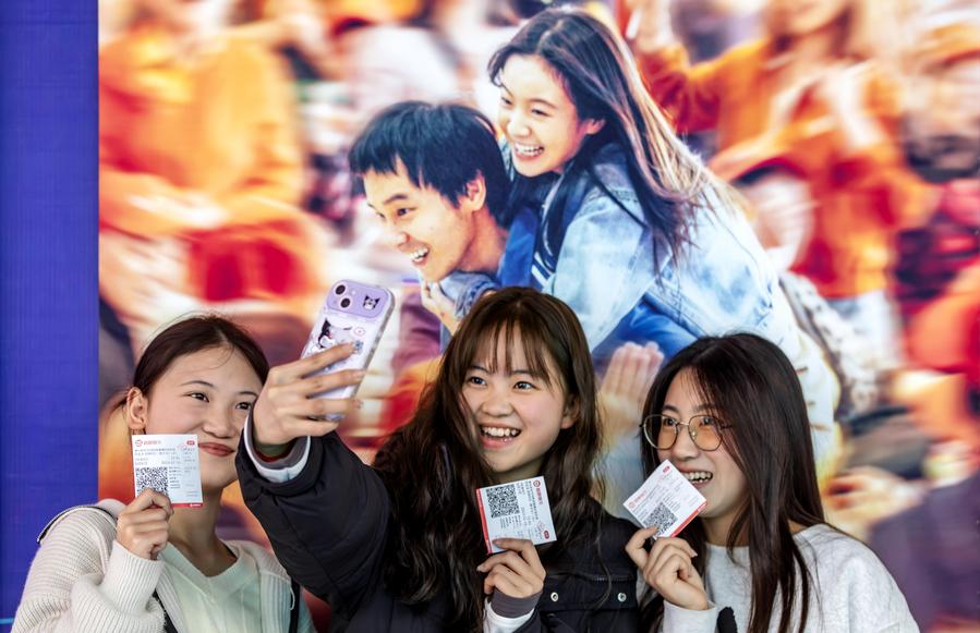 Movie-goers take selfies in front of a movie poster at a theater in Qianxi City, southwest China's Guizhou Province, Feb. 18, 2024. (Photo by Fan Hui/Xinhua)