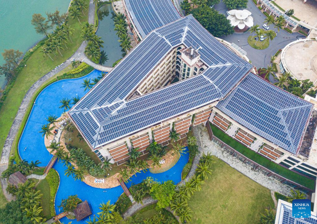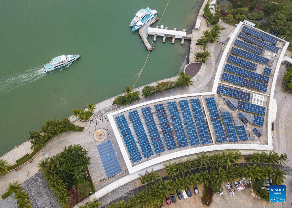 An aerial drone photo taken on March 16, 2024 shows photovoltaic tiles in the Boao near-zero carbon demonstration zone in Boao, south China's Hainan Province. The Boao near-zero carbon demonstration zone was put into operation on Monday. Operation and management of the zone is carried out in a smart way to achieve near-zero carbon emission at the regional level. (Xinhua/Yang Guanyu)