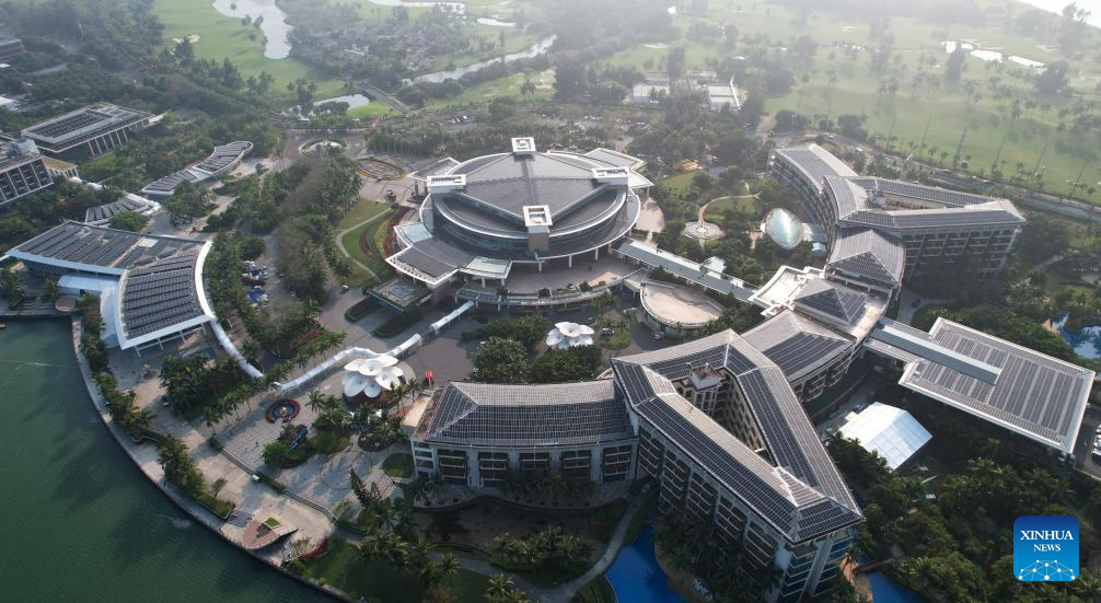 An aerial drone photo taken on March 9, 2024 shows the renovated press center of the Boao Forum for Asia (BFA) and photovoltic tiles in the Boao near-zero carbon demonstration zone in Boao, south China's Hainan Province. The Boao near-zero carbon demonstration zone was put into operation on Monday. Operation and management of the zone is carried out in a smart way to achieve near-zero carbon emission at the regional level. (Xinhua/Pu Xiaoxu)