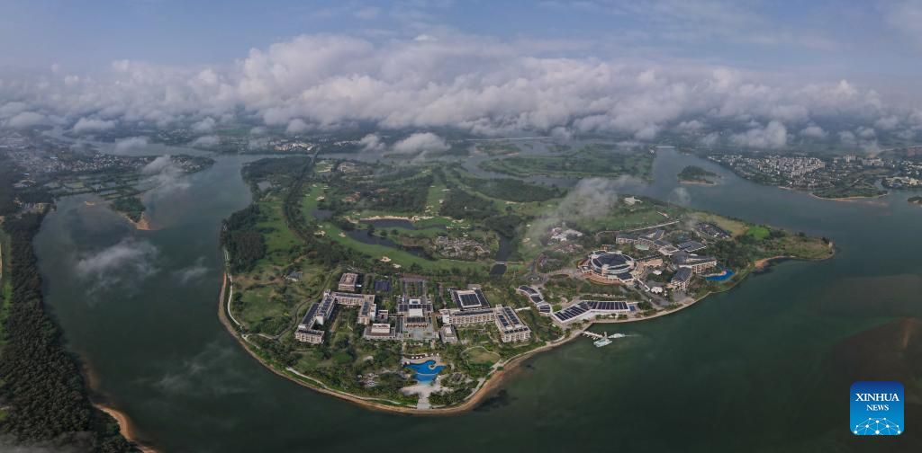 An aerial drone photo taken on March 17, 2024 shows the Boao Forum for Asia (BFA) International Conference Center and hotel after renovation in the Boao near-zero carbon demonstration zone in Boao, south China's Hainan Province. The Boao near-zero carbon demonstration zone was put into operation on Monday. Operation and management of the zone is carried out in a smart way to achieve near-zero carbon emission at the regional level. (Xinhua/Yang Guanyu)