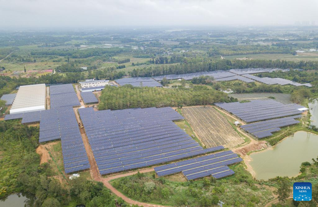 An aerial drone photo taken on March 9, 2024 shows an energy storage system in the Boao near-zero carbon demonstration zone and an agriculture-complementary photovoltaic power generation project in Boao, south China's Hainan Province. The Boao near-zero carbon demonstration zone was put into operation on Monday. Operation and management of the zone is carried out in a smart way to achieve near-zero carbon emission at the regional level. (Xinhua/Pu Xiaoxu)